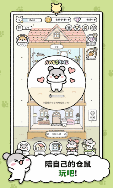 这款游戏是一款非常可爱的卡通风格,里面有一只可爱的仓鼠,每一只仓鼠都长得各不相同,玩家(wanjia)们可以(keyi)在这款游戏中搭建自己的宠物仓鼠乐园,你要做的就是与这只仓鼠保持良好的感情,熟悉它的生活习惯,然后好好(haohao)照顾它。完成大量的任务也可以(keyi)得到很多可以(keyi)提升仓鼠等级的奖励。游戏的玩法很简单,也很好玩,可以(keyi)让你在这个过程中获得更多的乐趣。