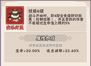 红品:不灭妖火,生命值首次低于30%时,降低N%所受伤害(shanghai),持续到战斗结束 上述妖灵可挑选(xuan)出(chu)自己当前拥有的进行搭配,都没有的话可以进行关卡挑战去获取更多的聚灵符来抽取妖灵