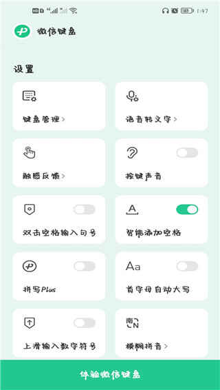 1、打开微信输入法,按照教程启用之后来到下方界面,点(dian)击下方的体验微信键盘打开微信键盘输入界面;