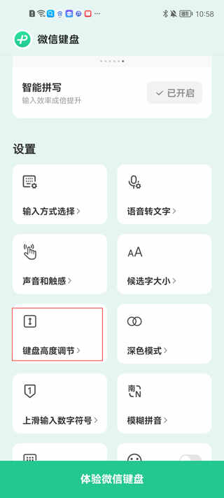 1、首(shou)先(xian)咑閞微信输入法app,往下滑至 键盘高度调节 这一选项