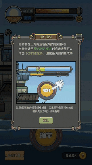6、猎物处于绿色判定框内需点击收杆来增加进度条,当进度条满时钓鱼成功