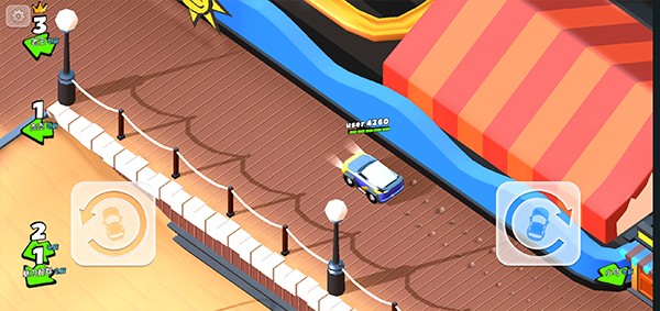 1、玩家只需要按下左右半屏就可以让车子转向了,车子会自动前进,游戏没有油门按钮哦,此外,点击(dianji)右方的道具按钮可以使用道具。