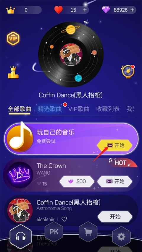 1、进入游戏选(xuan)择(ze)玩自己的音乐,点击开始
