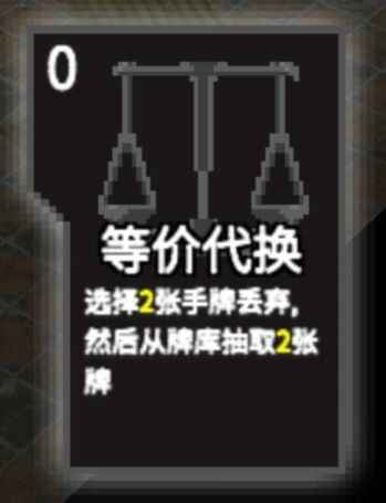 等价代换:选择两张牌丢弃(当手牌为空可以不丢弃),从牌库抽两张牌,利用可以弃1(使用代换自身也算弃牌)抽2的功能。弥补上使用其他卡牌带来的手牌数减少