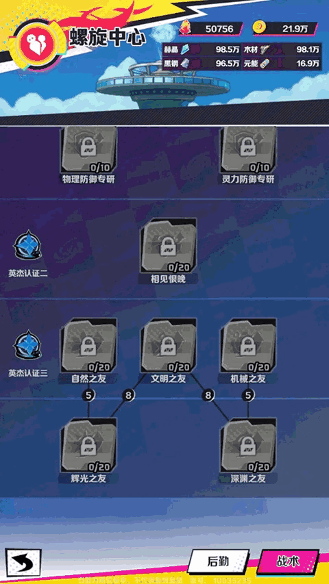 后勤建设以资源获取和加速研究螺旋中心为主,前期资源消耗较快,推荐(jian)升级几种资源的产出优化。