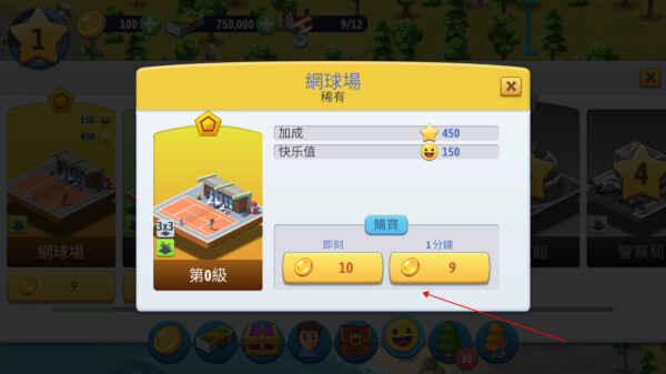 7. 例如,点击购买网球场。