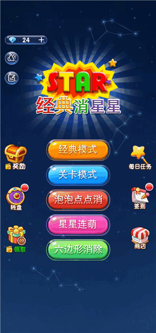 玩法概述:经典模式是游戏的基础模式,玩家需要通过点击相邻的相同颜色的星星进行消除。每次消除会根据星星的数量和排列获得分数。随着游戏进度的推进,关卡的难度逐渐增加,玩家需要在限定的步数或时间内完成任务。