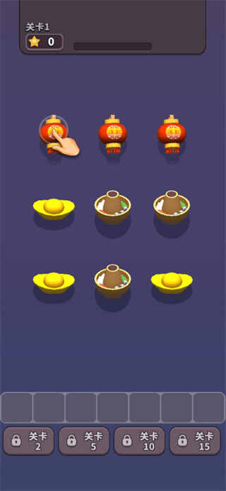 2、游戏中,玩家需要点击关卡中的物品并将它们拖动到屏(ping)幕(mu)下方的方块区域中。