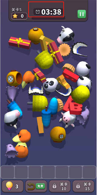 4、游戏界面上方会显示一个倒计时。当时间耗尽时,游戏将会结束。另外,如果下方的方块区域被物品填满且无法继续消除,游戏也会结束。