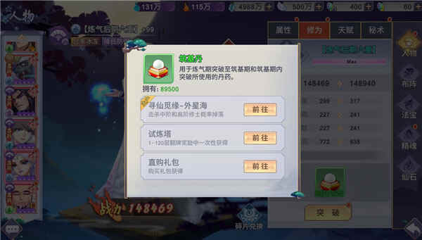 突破阶段:当达(da)到(dao)极致后,需要使用突破丹药进行突破,这些丹药可以通过其他活动获得。突破后可以再次进行提升,周而复始,直到达(da)到(dao)新的(new)级别,需使用全新的(new)丹药。