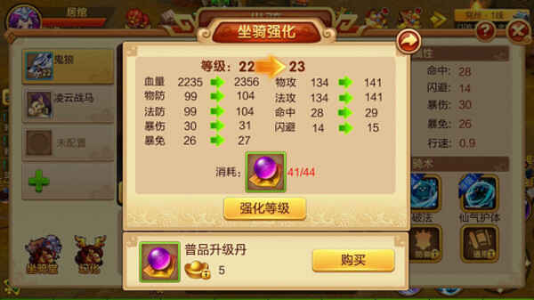每匹坐骑都会提供独特的附加属性,这些属性会随着坐骑的强化而得到提升。强化过程中,玩家将消耗普通升级丹,并且每提升10级,坐骑都会进行一次进阶突破,进一步增强其属性。