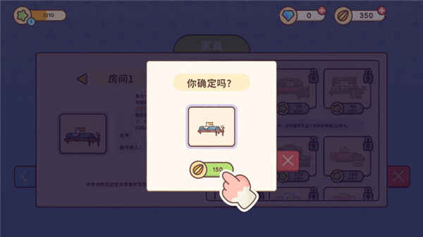4. 选择喜欢的床型并确认购买,床铺将自动加入旅馆。
