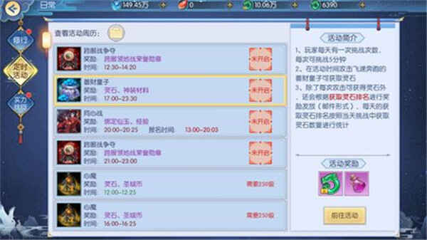 在破晓九天的定时活动中,玩家可以通过参与“善财童子”活动和“护送美人”活动,获得丰厚的灵石奖励。这些活动通常会在特定时间段内开启,参与其中能够获得大量灵石,帮助玩家提升实力。