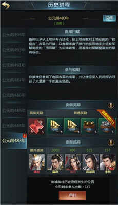 每天参与历史进程可获得奖励,历史进程会讲述一个历史事件,玩家可以委派武将参与。