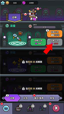 4. 在商城中点击召唤按钮,进(jin)行(xing)抽取并升级你的武器。如果任务(renwu)失败(fail)也无需担(dan)心,只需将史莱姆放置在那里,继(ji)续挂机并升级属性即可。