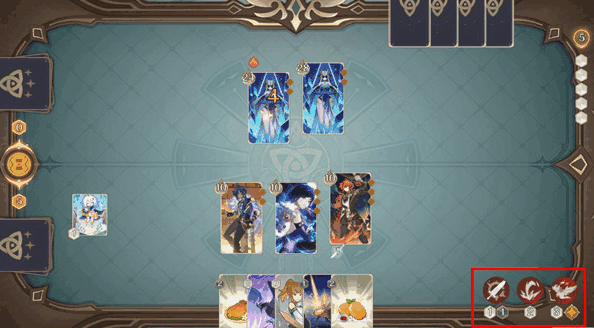 5、元素骰:在每局对局(game)中,所有行动都需消耗「元素骰」。每回合开始时,玩家会获得8个元素骰,并且有一次机会重投任意数量的骰子。