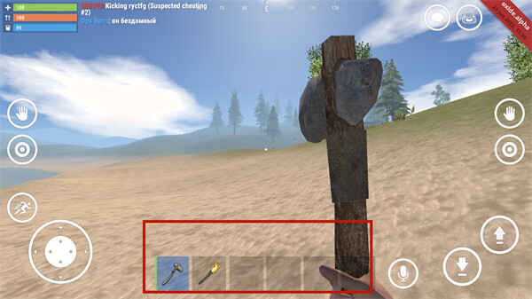 2. 点击屏幕右上角的背包图标,打开背包查看你能制造的物品列表和当前装备情况。你还可以把物品拖到屏幕下方的快捷栏中,点击不相同的物品来快速切换激活它们,方便随时使用。