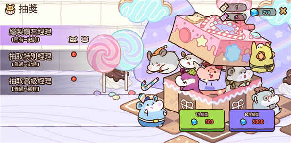 在游戏中,你可以通过抽奖系统获得各种仓鼠。抽奖是一个非常重要的功能,因为不同的仓鼠拥有不同的工作效率和特殊技能。你可以通过积累游戏内的资源或使用特殊道具进行抽奖,来增加你的仓鼠员工。