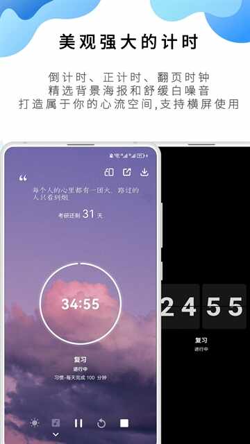 静心的白噪音,赏心悦目的番茄钟海报能够帮助你高效专注。同时可自定义番茄钟和休息的时长以及循环次数等等。