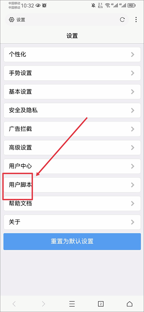 3、进入后设置界面后,点击用户脚本