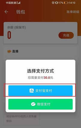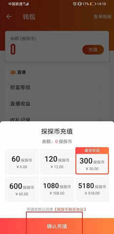 第四步点击之后(hou),取舍要充值探探币的数(shu)量,点击确认充值。
