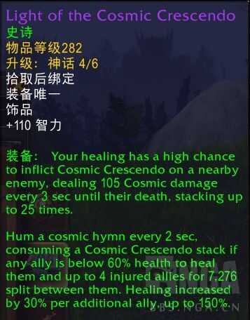 每2秒吟唱一次(once)宇宙圣歌,若有任一盟友生命值低于60%,则消(xiao)耗一层"宇宙渐强"为其和最多4名受伤的盟友分摊治疗7,276点。每额(e)外(wai)治疗一(yi)名盟友,治疗量提高30%,最多150%。