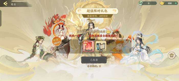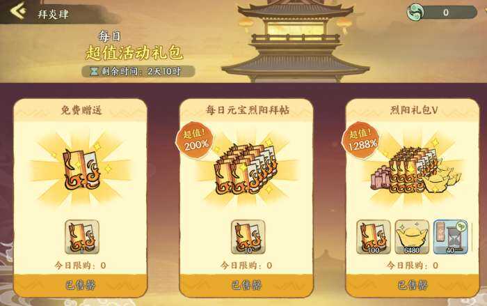在升級主建筑,初次開放龟甲,钓鱼,瑞兽等情景中有时会触发限时礼包,这种礼包比每日礼包稍微值一点,但预算不多也最好不(bu)要买。