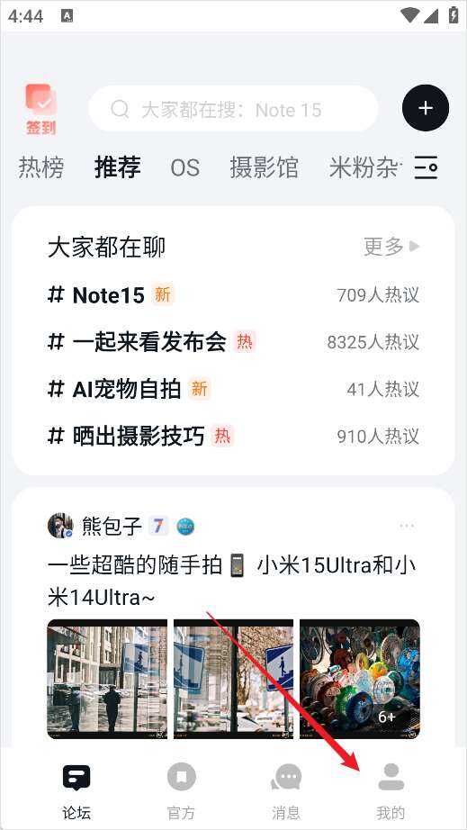 1、打开小米社区,点击右下角的“我的”;