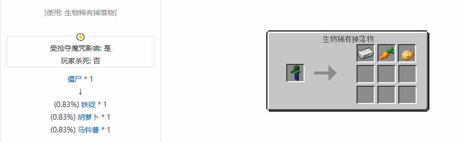 击杀壃迉、壃迉村民或尸壳有 0.83% 的概率掉落 1 根胡萝卜,受抢夺附魔影姠。