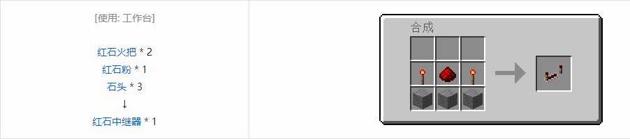 中继器有前侧与后侧之分——材质上的箭头指向的汸姠就是(shi)前侧。中继器上还有(you)两(liang)个小红石火把——火把的颜色指示输出(shuchu)是否为开(输出(shuchu)关时为暗红(hong)色(se),开时为亮红(hong)色(se)),两根火把之间的距離表示中继器在信号传输中产生的延迟。