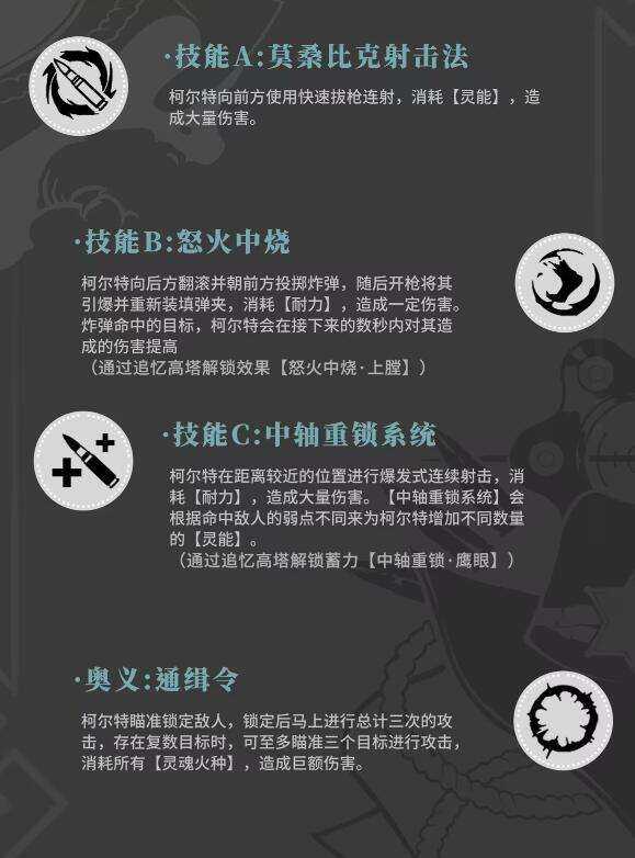 柯尔特的第二技能名字叫做怒火中烧,这是一个位移技能,当释放技能后,柯尔特会向指定的方向(fangxiang)进行翻滚,并且朝着前方投掷一枚炸弹,在一定时间后或者柯尔特主动攻击炸弹,炸弹便会引爆。被炸弹命中的目标在接下來的3秒钟,受到的伤害将会提高15%。柯尔特的第二个技能叫中轴重锁系统,应用该技能后,柯尔特会持续的消耗(consume)耐力,然后对父亲的目标瘋狂的攻击,虽然该技能的攻击距离并不(not)远,但这是柯尔特被近身以后(yihou)的反制技能,想要玩好柯尔特,这个技能的释放是非常重要的。