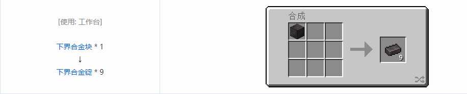 是原版游戏中最稀有的锭,由下界合金碎片和金锭合成获得,用于制造下界合金工具、武器(arms)和盔甲。