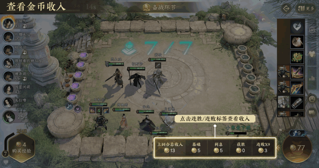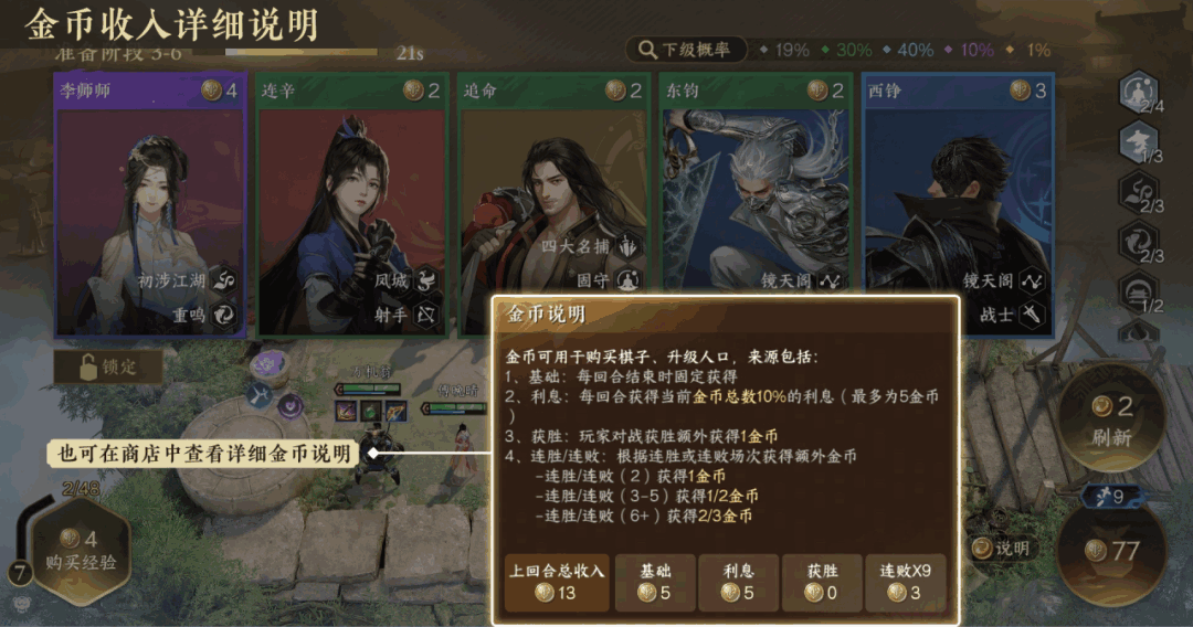金币的来源包括利息、连胜连败,每存10金币就能在下回合获得1利息,最多5利息,因此咱们通常可以积累到50金币让收益最大化哦!