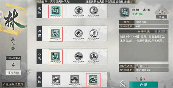 后续兵法技能点优先点出【养晦】,提升获取策书的速度。之后休(xiu)闲(xian)玩家可以点【木影】,提高木偶的获取数量,在有战斗的城池用木偶就行;战斗玩家可以点【薪传】,战斗失败后有概率为城池增加1队城防军。