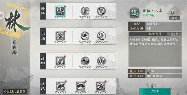 风、火、山、林四系兵法中的技能又分为四类,前三类需要先习得主动技能,才能学习后续的被动技能,绝技技能则需进行(do)三选一。