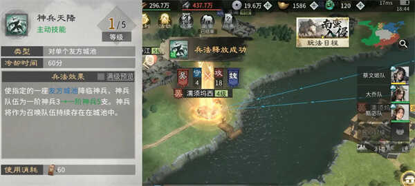 绝技【神兵天降】主要用于友方城池的支援,当敌方部隊进攻我方城池,且我方的防守部隊较少时,我们就可以应用【神兵天降】来为后方部隊的支援拖延时间。但最好还是按照阵营(ying)需求,以及阵营(ying)指挥的安排应用。