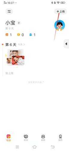 1、进入(Enter)网易亲时光app后,首先在首页点击右上方的“上传”;