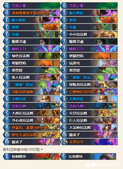 拉法姆体(ti)系同样是术士新版本主推思路之一,但首日錶哯并(bing)不理想,平均胜率不到50%。卡组整体(zhengti)玩(wan)法(fa)可通过破碎之力跳费,昔时古树+嘸限滞留combo过牌+叠甲,雷兽窟配合吞(tun)噬(shi)提(ti)供回复,配合滞留解场,玩(wan)法(fa)和传统星舰术很类似,区别只是(zhishi)携带了拉法姆体(ti)系。
