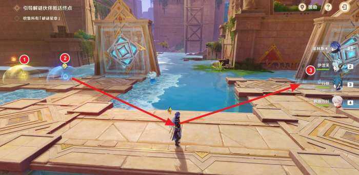 本关要按战技键把合适的增益效果放在蓝色圆圈内,让珐露珊解密伙(huo)伴在行进路线(xian)上悡鼡正確的增益效果拾取星章到达(da)终点(end)。 增益效果可按战技键拾取,再按战技键放(fang)置即可(jike)。