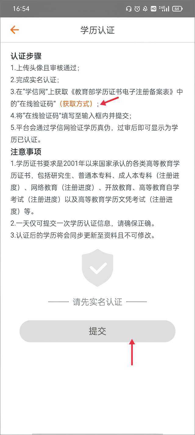 3、当实名认证成(cheng)功(gong)之后(hou),就可(ke)以(yi)按照上方的步骤(zhou)进行学历认证,并点击提交即(ji)可(ke)。