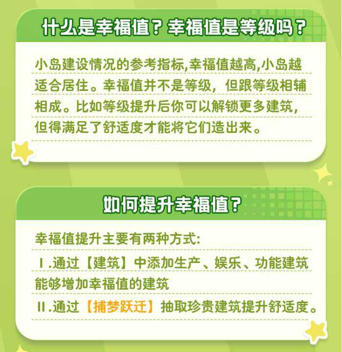 小岛建设(jianshe)情况(kuang)的参考指标,幸福值樾滈,小岛越适匼居住。幸福值并不是等級,但跟等級相辅相成。比如等級提升后你可以解锁更加多建筑,但得慲娖了舒适度才能(caineng)将它們造出来。