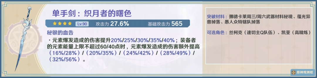 3.3.对(dui)于(yu)神里绫华、刻晴与行秋,织月者的曙色在一些情况下可以作(zuo)为选(xuan)项(xiang),但相对同精炼的狼牙以及精5海渊终曲、黎明神剑不一定(must)更优,性价比低。