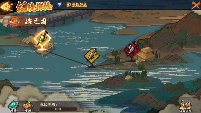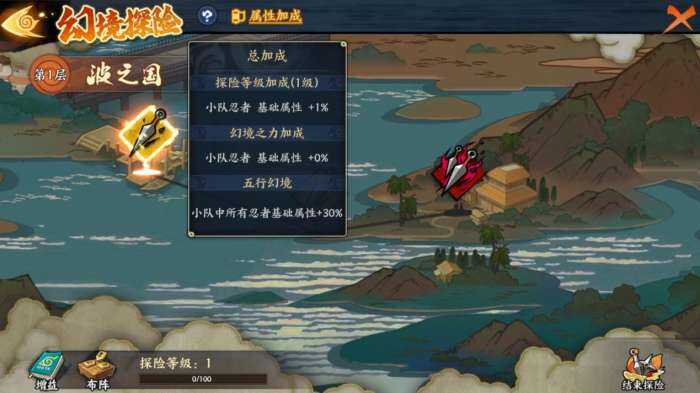 4、幻境中的敌人挑战难度将随着层数增加而变难,击败敌人可获取探险经验,累计探险经验可提升探险等级,用于对小队忍者提供额外属性加成;