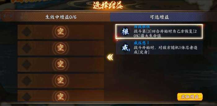 8、幻境探险中有许多类型的增益,需要根据出战忍者的技能(jineng)效果和特性,选择更加适配的增益,能达到事半功倍的效果;