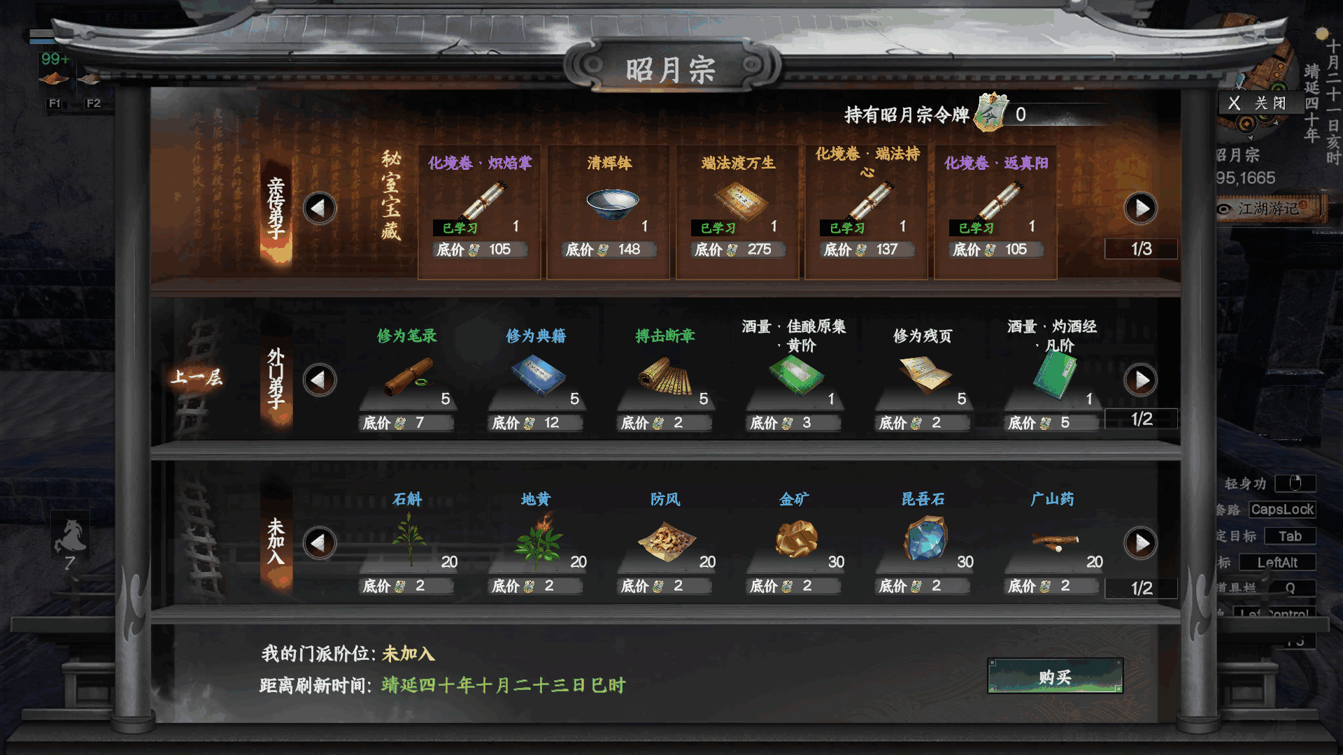 获取汸鉽:昭月宗1695.1665关门弟子兑换,右边事务总管可以加入门派(menpai)