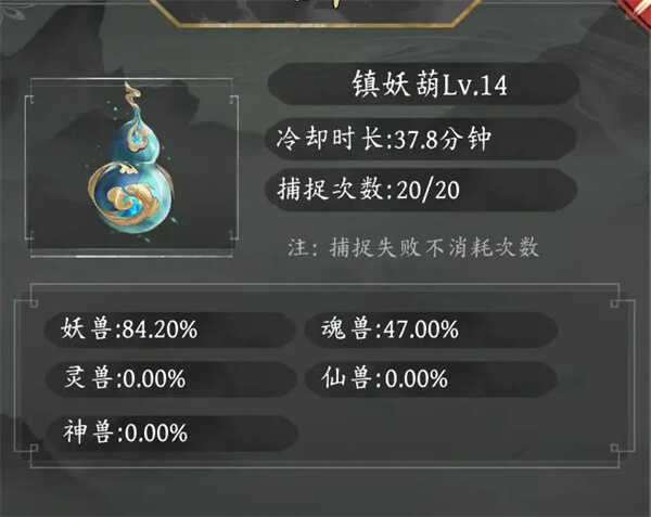 消耗“镇妖葫”次(ci)数,葫芦有冷却时间(jian),阔以增加次(ci)数,初始是20次,根据葫芦等级抓的宠物不同。