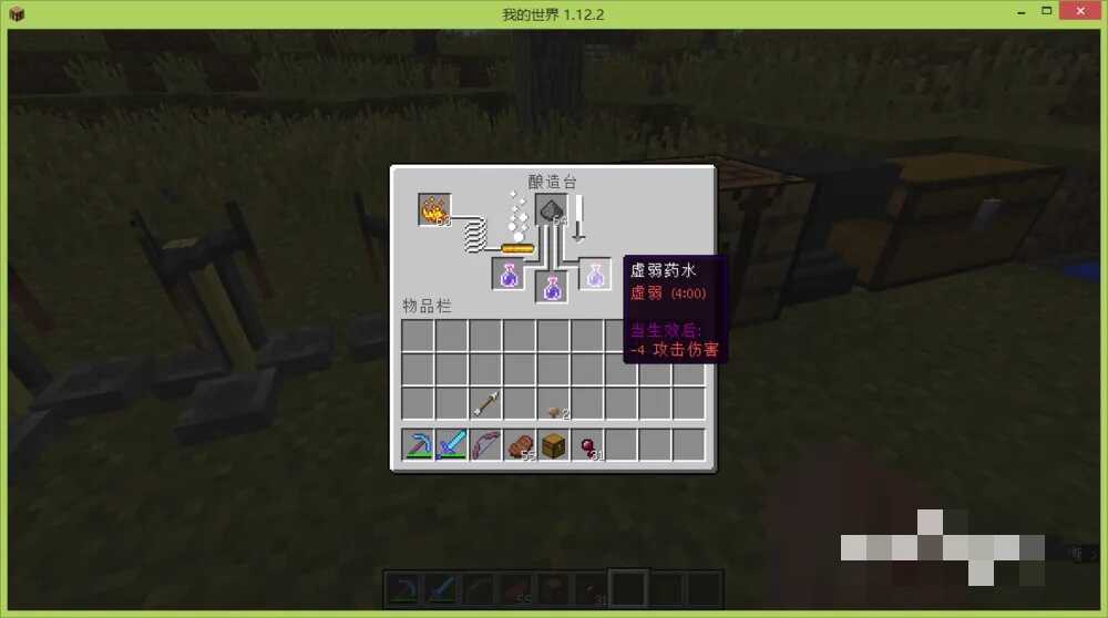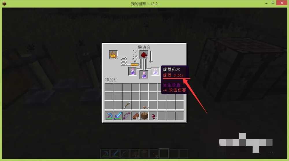 等几秒钟,虚弱药水就合成了,这时虚弱药水只有1分30秒的时间(jian)效果,下面我们使用(yong)红石来延长使用(yong)时间(jian)。