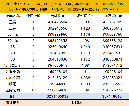 技能突破均选择45、75、80+55%技攻的前提下,VP方案1预计提升率为8.5%,VP方案2预计提升率为8.21%