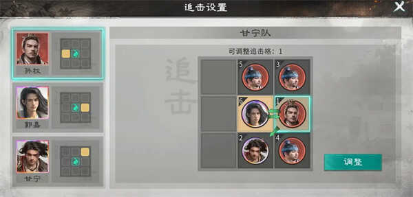 孙权站前排踩郭嘉和甘宁的追击格,郭嘉踩甘宁的追击格,甘宁双主动无需(xu)踩追击格。