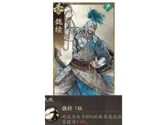 魏续核心的竞争力就在于低成本高适配,会(hui)有一个骁掠天赋在针对高兵力的敌军时就能增加9%的增伤,如果搭配(dapei)曹操的全域增伤buff,就能有效提升平民武将的伤害上限。阵容核心的逻辑就在于一个承伤输出,一个buff赋能,然后加上一个机动拉扯。在阵容搭配(dapei)时,可以将魏续搭配(dapei)曹操,然后搭配(dapei)宋宪。魏续是一个半肉主c,主要是负责前排承担伤害,还有核心输出。曹操就属于一个全能辅助角色,可以有效提供增伤的优势,而且(and)还有一个减伤的buff。